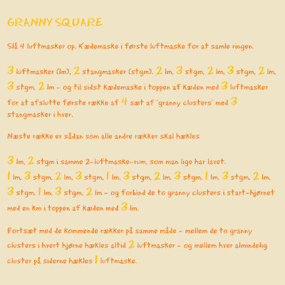 Jeg har skrevet ned hvordan du kommer i gang med et granny square. Række to er samme måde som resten af firkanten hækles på - så man fortsætter bare indtil firkanten har en ønsket størrelse. Hvis du vil se en video om hvordan man starter dette granny square, så finder du en god en her.